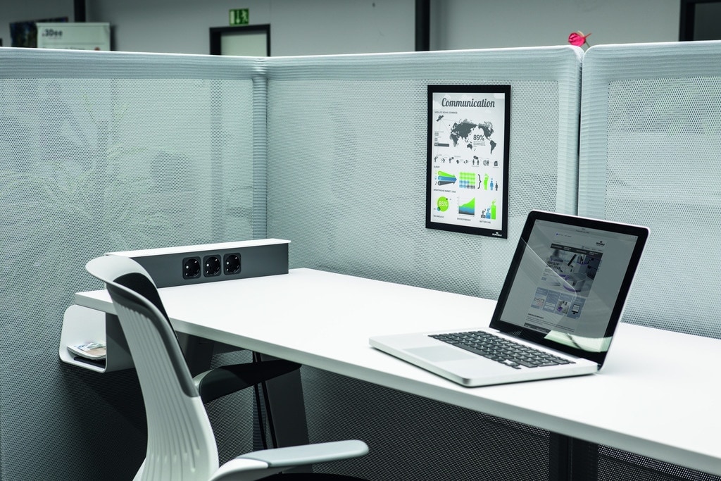 Le cadre d’affichage DURAFRAME® GRIP auto-agrippant se fixe sur des surfaces en tissu et textile, telles que des cloisons acoustiques, tableaux d’affichage, etc.