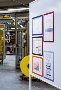 Les cadres DURAFRAME® existent en plusieurs formats (A5, A4, A3, A2, A1) et en différentes couleurs, permettant de créer un véritable code visuel : rouge pour la sécurité, vert pour les indicateurs de performance, bleu pour la maintenance, jaune pour les consignes qualité, etc. Ce repérage immédiat renforce la lisibilité et l’efficacité du management visuel.